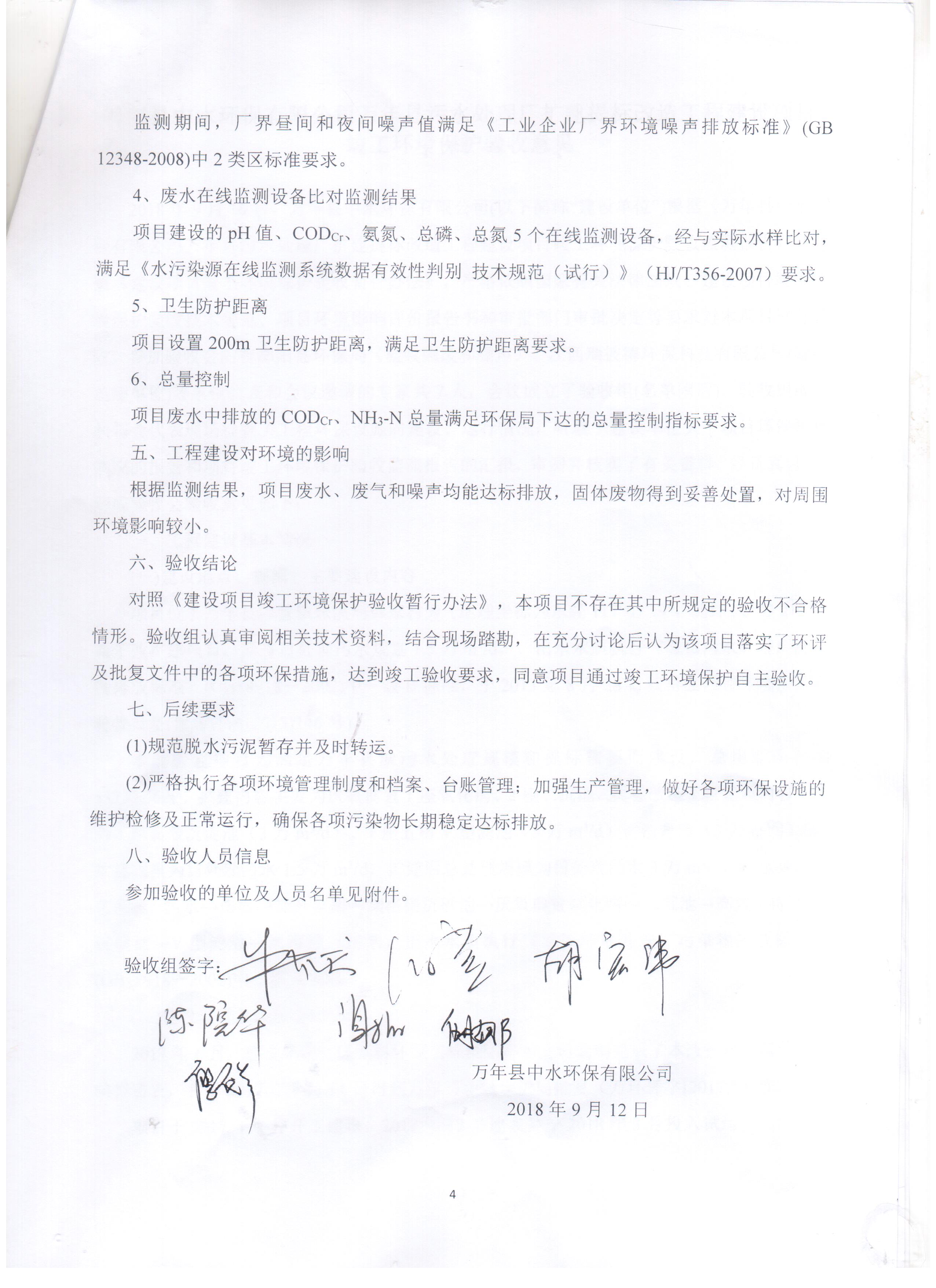 2018年9月16日,萬年縣中水環保有限公司組織召開“萬年縣污水處理廠擴建提標改造工程項目竣工環境保護驗收會”。參加驗收會的有鄱陽縣環保局(驗收固廢和噪聲)、江西瑞彼德環??萍加邢薰荆炇毡O測單位)等單位代表和會議邀請的專家共7人。與會代表及專家會前現場檢查了工程環保設施的建設、運行情況,會上聽取了建設單位關于項目環保執行情況的報告和項目竣工環境保護驗收監測報告的匯報,審閱并核實了有關資料,經過認真討論,驗收組認為萬年縣中水環保有限公司萬年縣污水處理廠執行了環境影響評價制度,項目建設過程中落實了環評報告及批復的要求,嚴格執行了“三同時”制度,各類污染物監測結果符合相關驗收排放要求,因此,該建設項目驗收合格,現特此進行公示。